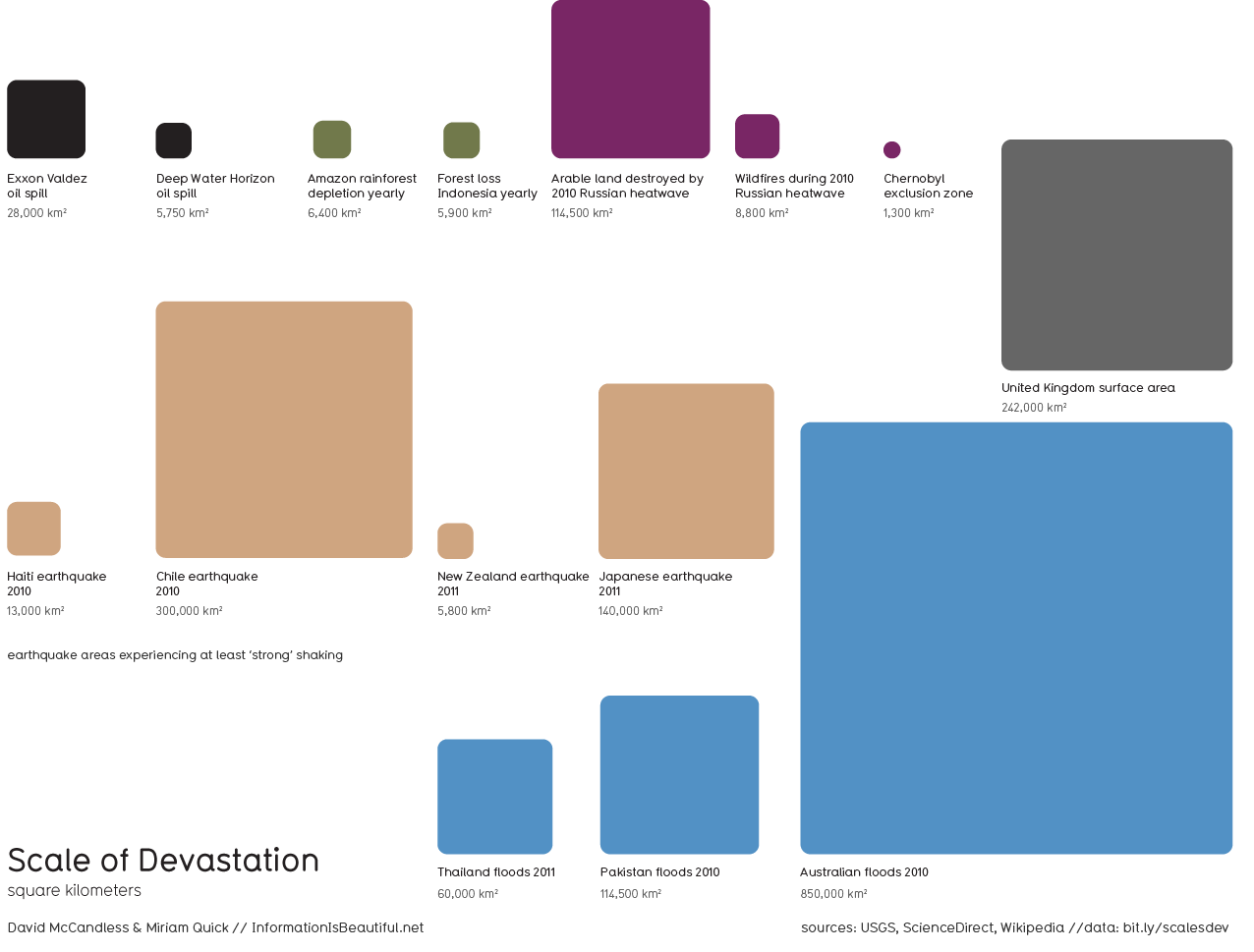 You might be surprised to see that the Australian floods of 2010 have a much larger scale of devastation by land size than any of the other disasters shown, larger than the shocking Japanese earthquake of 2011 for example.