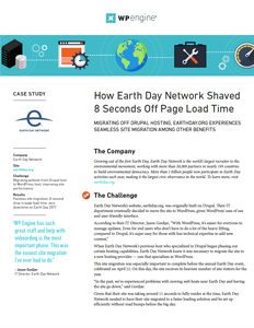 According to their IT Director, Jason Gooljar, “In the past, we’ve experienced problems with moving web hosts near Earth Day and having the site go down.” In this case study, read about how Earth Day Network seamlessly migrated their site to WP Engine with zero downtime. In addition, find out how they shaved off eight seconds of page load time from the initial 11 seconds it took for their home page to fully render.