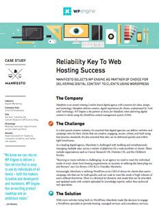 With more websites being built on WordPress, Manifesto made the decision to engage a WordPress specialist. Manifesto turned to WP Engine. Read on to see how the partnership has improved platform flexibility, increased reliability, and faster site speeds for Manifesto’s key clients.